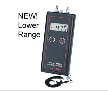 475-FM MarkIII数字压力计具有耐用的铝外壳和坚硬的玻璃纤维面板。标准的9伏电池可使用100小时。前面板的两个按钮控制产品的开/关和英制/公制的转换。产品没有设定和升级。零点调节旋钮在产品的顶部。1/2″的LCD显示屏可方便读数,并最低限度的减小数据收集错误。产品还有一个电力不足指示。压力传感器为高可靠性的硅片压阻设备。标准连接为1/8″或3/16″内径的乙烯或橡胶管。完整说明见产品背面。